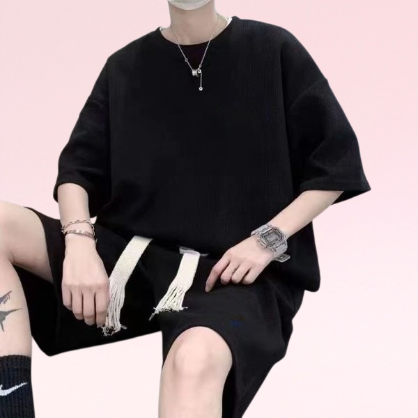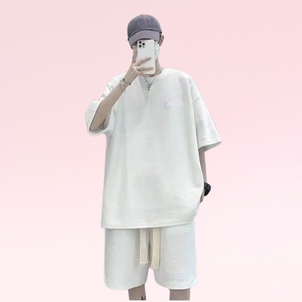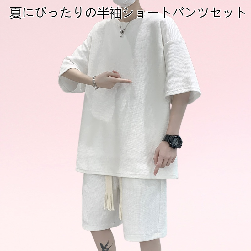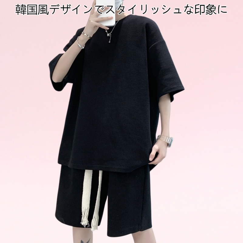 夏に最適な半袖とショートパンツのセットアップ。韓国風デザインでトレンド感を演出。ゆったりとしたルーズシルエットで快適な着心地。