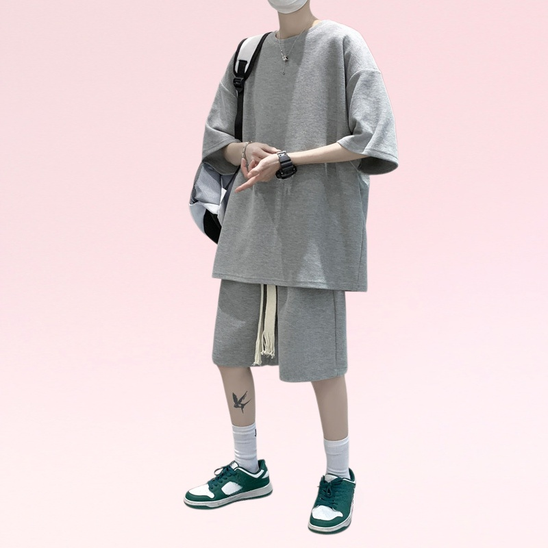 メンズカジュアルスーツ夏ユーストレンド半袖韓国風ルーズショートパンツスポーツハンサムツーピーススーツ